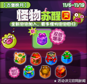更有小橘丁泡泡、章鱼小丸子泡泡、怪咖机器人泡泡、怪咖本咖泡泡、冰封小熊喵泡泡、食人花泡泡、火焰领主泡泡,限时回归!
