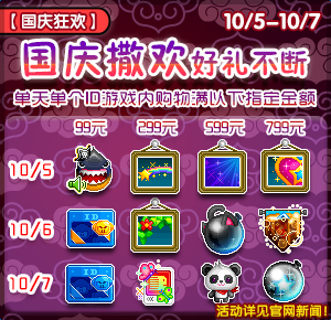 国庆期间(9月30日—10月7日),每天单个ID在游戏内购物满足对应金额,即可获得对应道具奖励哦!