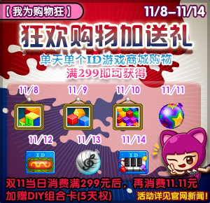 活动期间单天单个ID在游戏内购物买299元,就可以获得极品道具永久权一件哦,