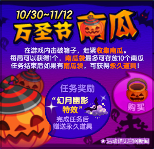 游戏中炸开箱子会爆出南瓜,收集后可获得新品装扮道具(幻月幽影)。