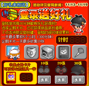 - 登陆游戏后,每经过30分钟能领取游戏道具或卡片道具一种。